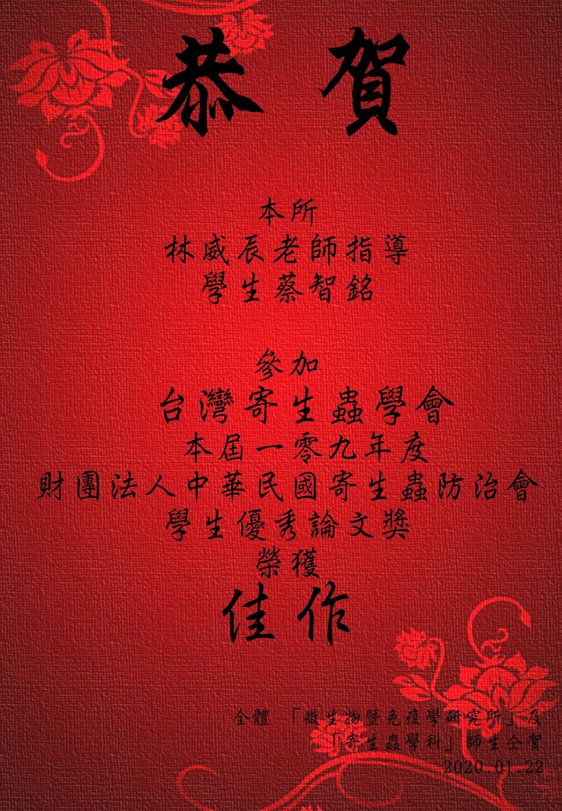恭賀本所林威辰老師指導學生王昱仁、蔡智銘 榮獲台灣寄生蟲學會 一零九年度中華民國寄生蟲防治會 學生優秀論文獎 佳作